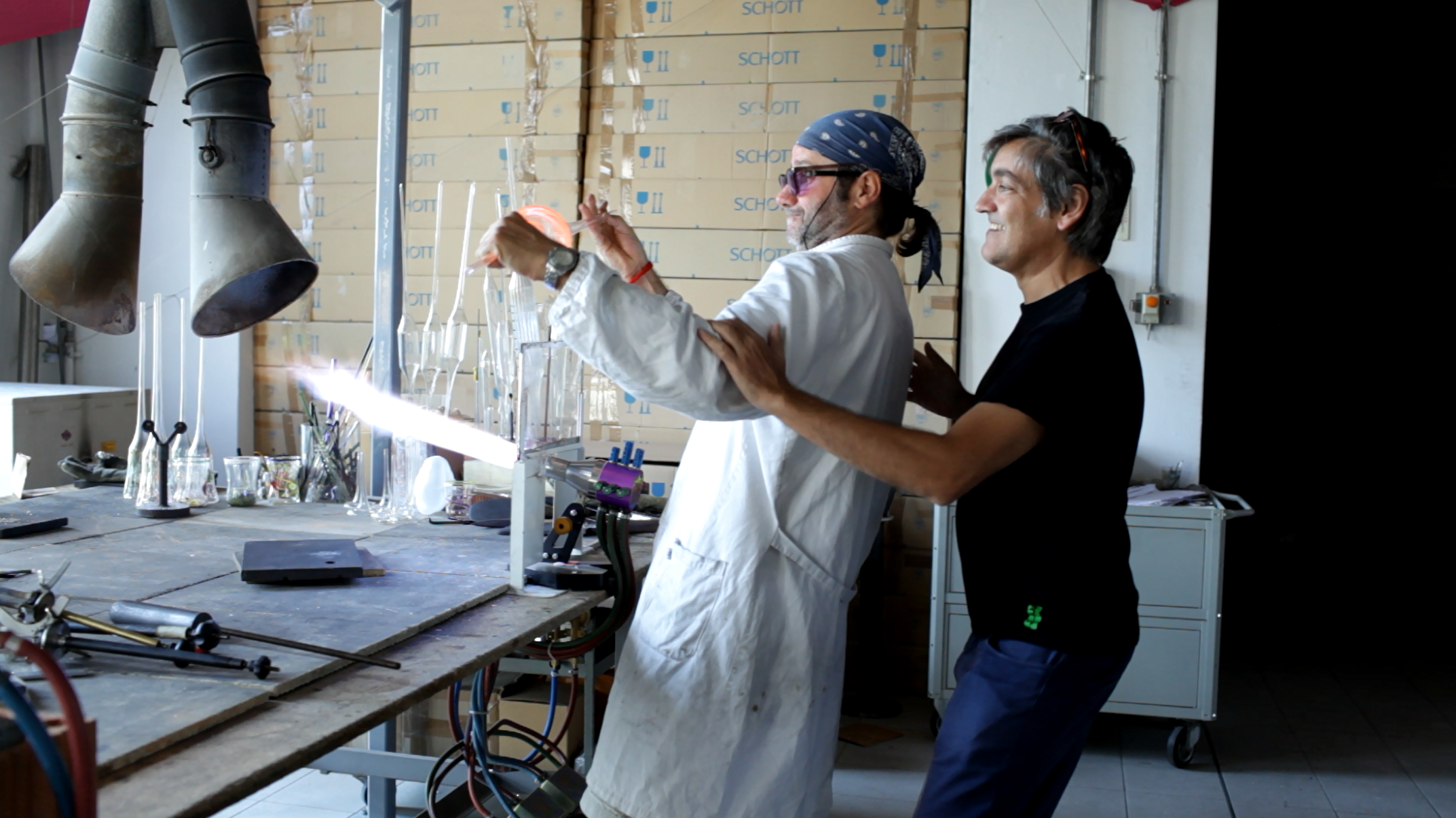 Now we are faced with a documentary video. San Giorgio di Perlena, 2014, inside a workshop, Massimo Lunardon, renowned glass artist. Lunardon is arranging his tools for blowing and shaping a traditional Venetian water vase, but behind him, the designer Martí Guixé is primed to begin a series of blows, shoves and jerks that will obstruct the entire laborious process of creation. A manifest boycott, or better yet, a manifesto of boycotting the artisan’s ability, of boycotting the wisdom handed down by tradition and the consciousness each of their movements produce. This is not a fight scene; both parties’ attitudes express complicity, free play and peer conflict. Neither the aggression of the party-pooping designer nor the resistance of the suffering artisan reach an intensity that overshadows the work process, which follows, albeit not invariably, its course. The result, Craft Terror, without impositions of preconceived happiness and born of a moment of fortune7 liberates its actors from the normative constraints within their respective disciplines, from their bonds to their professional profile and from the virtues of their previous work. A strange meeting of strangers from which a strange vase has sprung forth without having an already assigned place and without it being assigned to anybody.