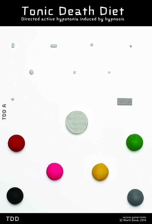 The Tonic Death Diet combines 3 areas of knowledge: medicine, animal biology and hypnosis. The Diet is designed to subvert the concept of the virtual world as a substitute of the real world, creating the opposite perception. The 2 main components of the TDD are the autohypnosis app and the nutrition pills. The diet helps you reach a temporary transordinary lifestyle status. This status promotes virtual activities that can be performed through any conventional computer interface. This temporary situation rejects real world, as conventionally understood. The Tonic Death Diet can be followed through ritual, spiritual, functional, emergency or fun purposes. It can also be followed simply to avoid gastronomy. A temporary active hypotonia is caused as directed by the autohypnosis app, and the body reaches a coma-like status. Body temperature descends to a hypothermia off 35,9 degrees. The mind feels active and concentrated; basic body functions are minimized but active. The trance state can last for a long period of time and the nutrition pills help you stay in it. The pills provide clean and healthy nutrition. Warning A “line of no return” can be reached. Medical consultancy: Dra. Isabel Beltran Margarit World Food Festival Rotterdam. |