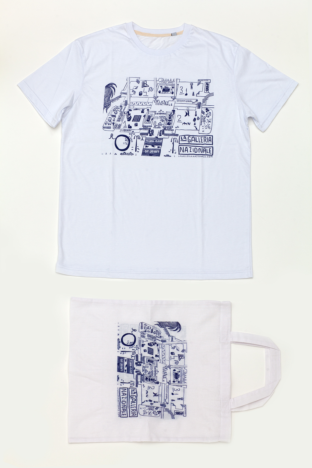 The Intuitive Brochure of La Galleria Nazionale in Rome has been turned into a t-shirt and a tote bag. Photo Inga Knölke 2020